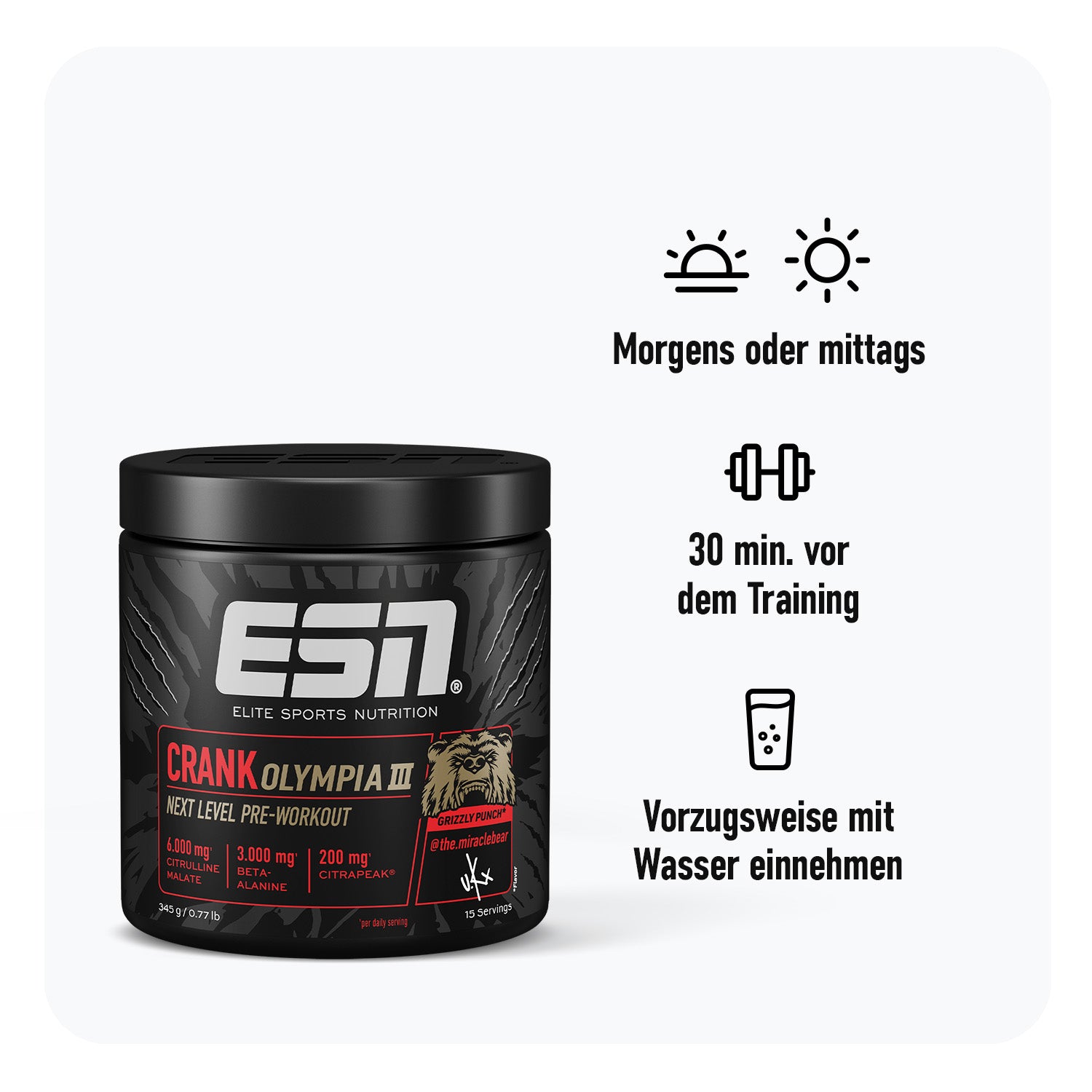 Mit Crank Olympia III haben wir die erfolgreiche Formulierung unseres Crank Olympia wieder auf ein ultimatives neues Level gehoben: mit dem innovativen Pump-Wirkstoff CitraPeak® – exklusiv bei ESN –  sowie einer erhöhten Synephrin-Dosierung und Niacin zur Maximierung deines Workouts.6