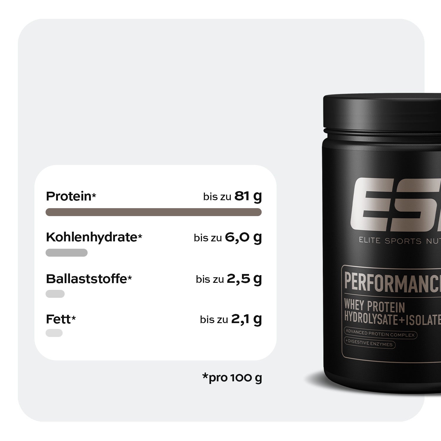 Unser Performance Whey liefert dir, was du für deine Ziele brauchst: Mit speziellem Protein-Komplex werden deine Muskeln schnell mit Protein versorgt – und das bei einem sehr geringen Anteil an Carbs, Fett und Zucker. Der spezielle Verdauungsenzym-Komplex sorgt für optimale Proteinaufnahme und verbesserte Verträglichkeit. Das perfekte Protein für ambitionierte Athleten. Created for progress, made for athletes.