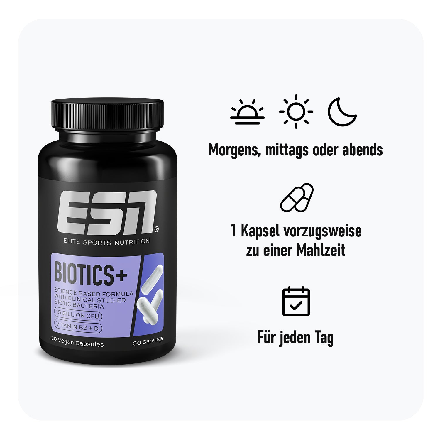 Unser Biotics+, entwickelt mit einem der weltbesten Probiotika-Forscher, Arthur Ouwehand, ist als hochdosierter Bakterien-Komplex sinnvoll kombiniert mit Vitamin B2 und Vitamin D ein echter Gut-Changer, wenn es um deinen Darm1 und dein normales Immunsystem 2 geht. Biotics+ enthält einen hochwertigen Bakterien-Komplex aus 4 Human-Bakterienstämmen, mit dem du deine Mikrobiota garantiert mit mindestens 15 Milliarden koloniebildenden Bakterien pro Kapsel versorgst. 34 Neben den hochwertigen Bakterienstämmen, deren Wirksamkeit und Sicherheit (auch in Stillzeit und Schwangerschaft) in klinischen Studien am Menschen bestätigt wurde 2, enthält Biotics+ zusätzlich Vitamin B2 und Vitamin D. 12 Diese unterstützen dich mit voller Power, indem sie zur Verringerung von Müdigkeit und Ermüdung, zur normalen Funktion des Immunsystems, zu einem normalen Energiestoffwechsel und zur Erhaltung der Darmschleimhaut beitragen. 12