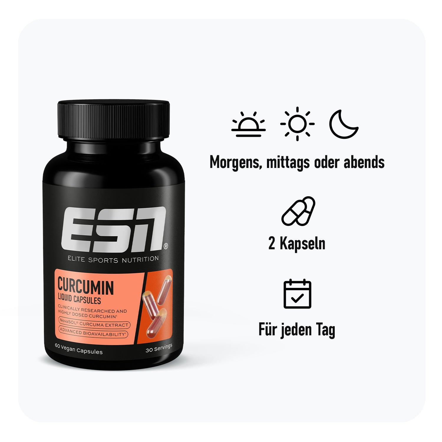 Get plant power – mit unseren Curcumin Liquid Capsules. Die hochwertigen Kurkuma-Kapseln enthalten die patentierte Premium NovaSol®-Flüssigform und bieten damit eine 185-fach bessere Bioverfügbarkeit als gewöhnlicher Pulverextrakt – standardisierte Qualität und Reinheit für volle Curcuma-Power in Kapseln.