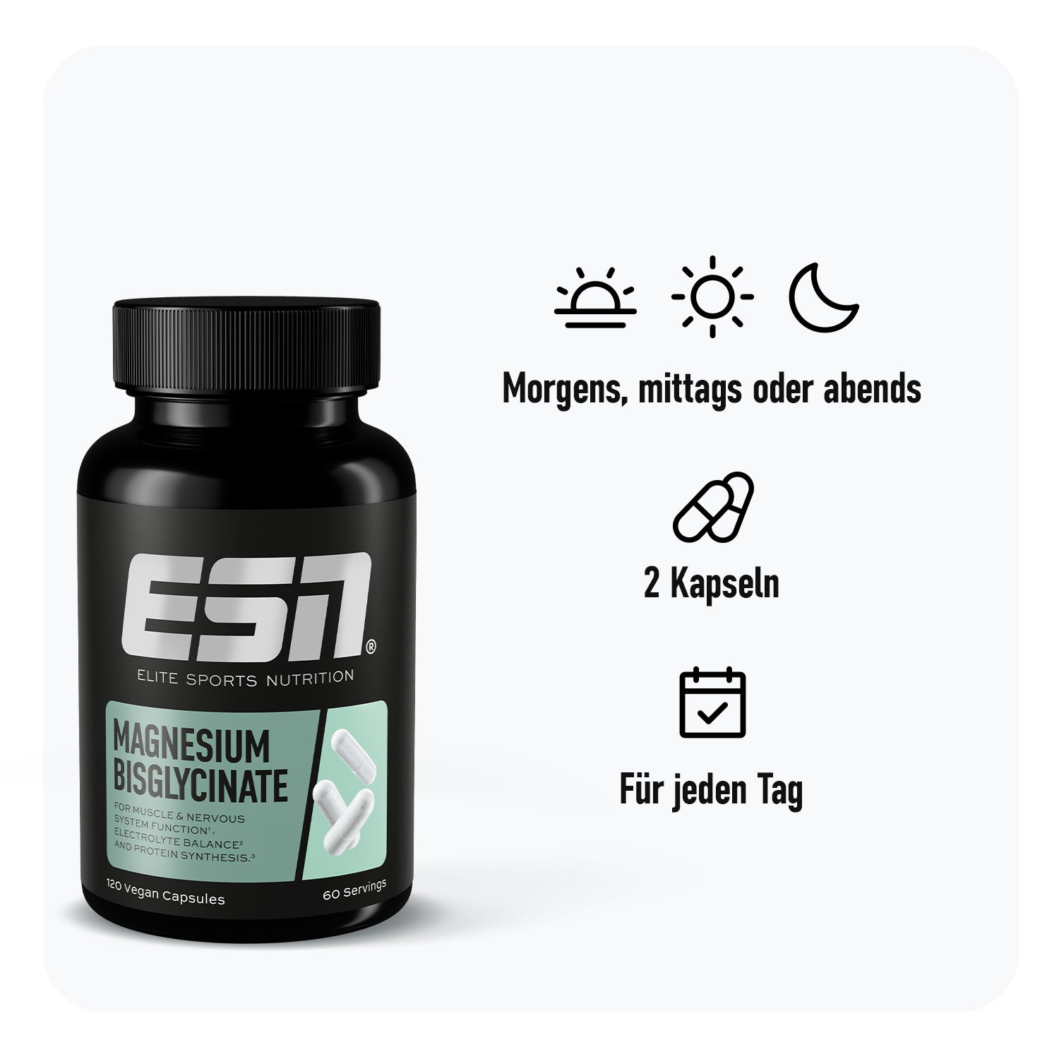 Bei unseren Magnesium-Kapseln haben wir uns für Magnesium in Form von Magnesiumbisglycinat entschieden, da es eine hohe Bioverfügbarkeit und eine verbesserte Absorption bietet – mehr Magnesium also dort ankommt, wo es auch benötigt wird. Kurz zur Definition: Magnesiumbisglycinat ist im Gegensatz zu anderen Magnesiumformen an die Aminosäure Glycin gebunden, was die Aufnahme im Körper erleichtert und die Verträglichkeit erhöht. Das bedeutet, dass du effektiver von den wesentlichen Vorteilen von Magnesium profitieren kannst: Während des Trainings unterstützt es u. a. die Muskelkontraktion, verringert Ermüdungserscheinungen.1 Und nach dem Training unterstützt es dich bei der Regeneration und hilft dir schneller zu regenerieren.1