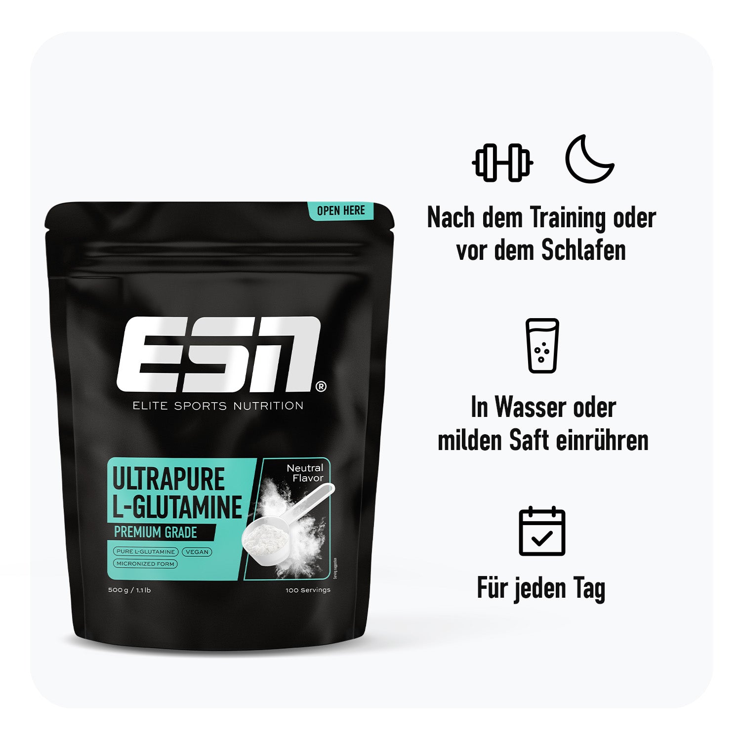 Das leicht einzunehmende Pulver enthält reines L-Glutamin in höchster Qualität und hohem Reinheitsgrad.