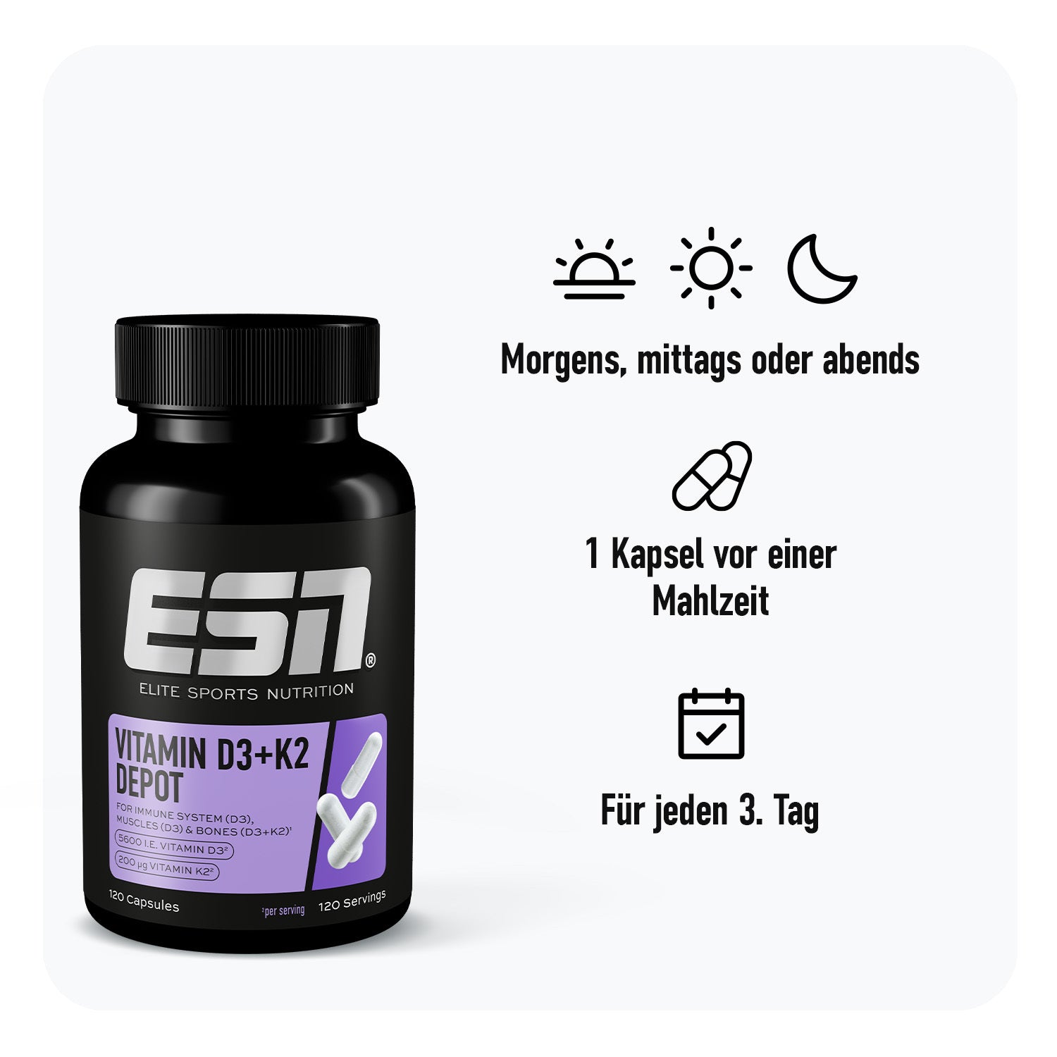 Vitamin power duo: Vitamin D3+K2. Die Kombi aus den Vitaminen D3 und K2 unterstützt effektiv deine Knochen, Muskeln, Immunsystem und Blutgerinnung.1,2 Der ideale Support für deine Performance-Base und das mit nur einer Kapsel alle drei Tage.