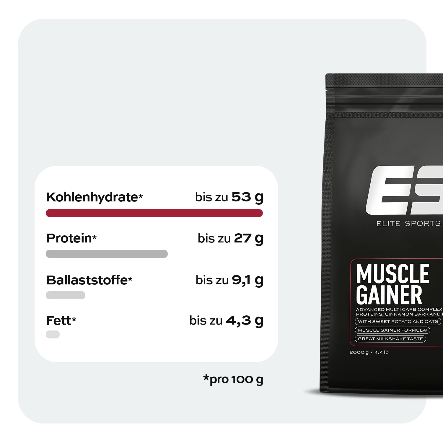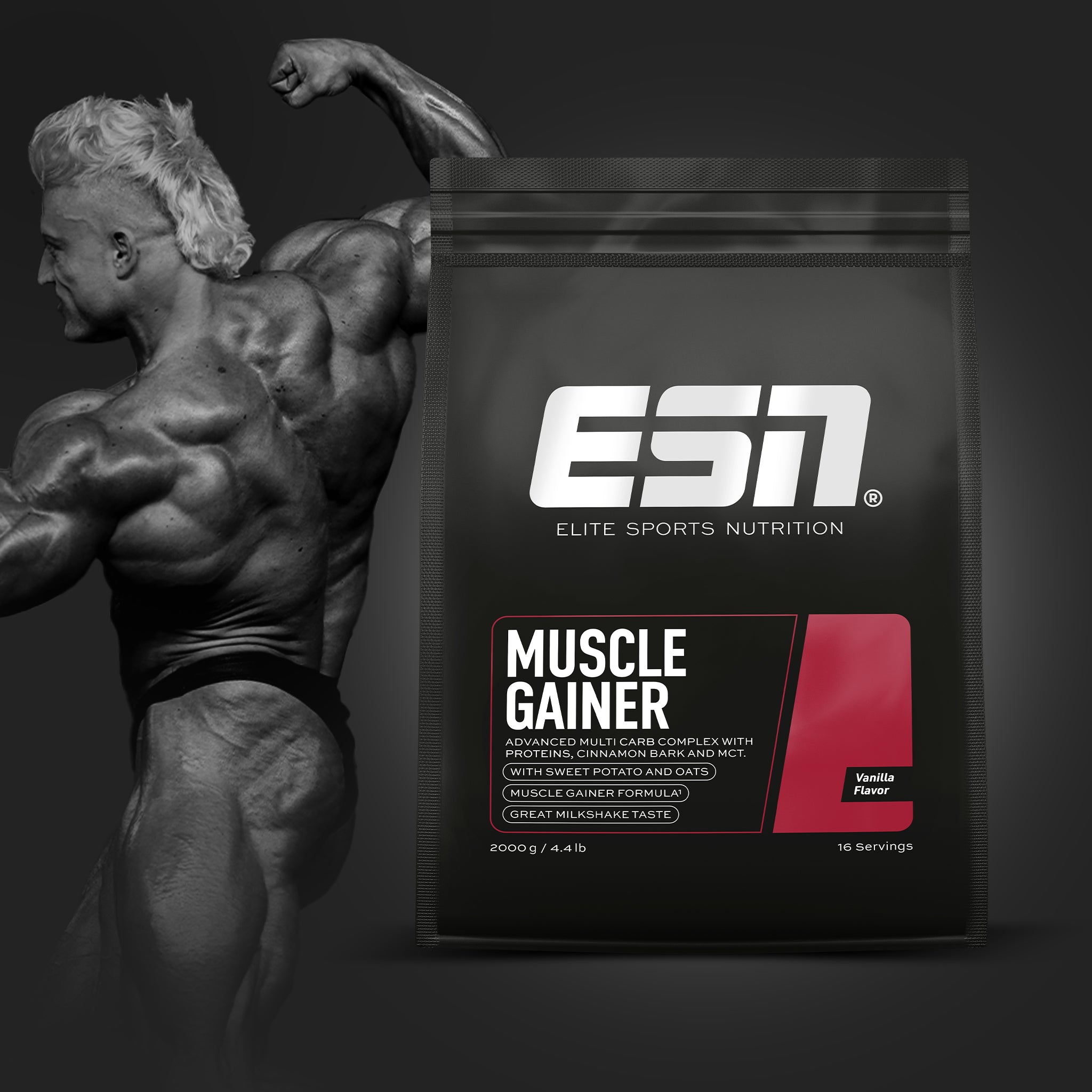 Du willst maximale Erfolge in deiner Muskelaufbauphase? Dann brauchst du mehr als nur hartes Training – du brauchst täglich einen Kalorienüberschuss und vor allem die besten Nährstoffe, die deinen Muskelaufbau auf das nächste Level bringen. Was du also brauchst, ist unser Muscle Gainer: Er liefert dir einen Advanced Multi Carb Complex für schnelle und langanhaltende Energie und optimale Regeneration, hochwertige Proteine für perfekten Muskel-Support, MCT-Öl für eine schnelle Energiezufuhr, verbesserte Kalorienaufnahme und Stoffwechsel-Support.1 On top enthält unser Muscle Gainer Verdauungsenzyme für eine optimale Verträglichkeit sowie Alpha-Liponsäure und Zimtrindenextrakt, um deine Nährstoffaufnahme zu maximieren. 3 Alles vereint in einem unvergleichlich cremigen Shake mit perfekt ausbalanciertem Nährstoffprofil: 500 kcal für dein Kalorienziel, bis zu 32 g Protein, 61 g Carbs und 11 g Fett. 2Der ultimative Gamechanger für deine Muskelaufbauphase – mehr geht nicht. Schauen wir uns an, wie genau unser Muscle Gainer deine Gains auf das nächste Level hebt.