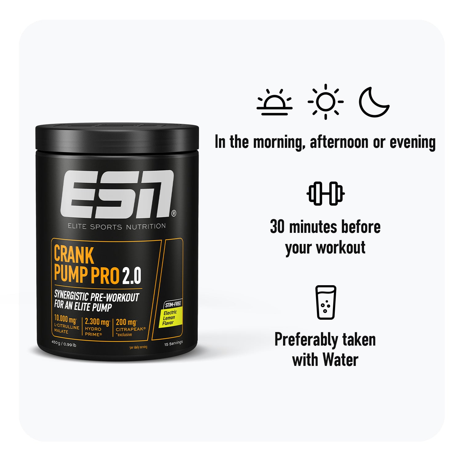 Crank Pump Pro 2.0 sets a new standard in pre-workouts. Featuring CitraPeak® – an innovative ingredient for muscle volume like you’ve never experienced before. Exclusively available in Europe in Crank Pump Pro 2.0.
