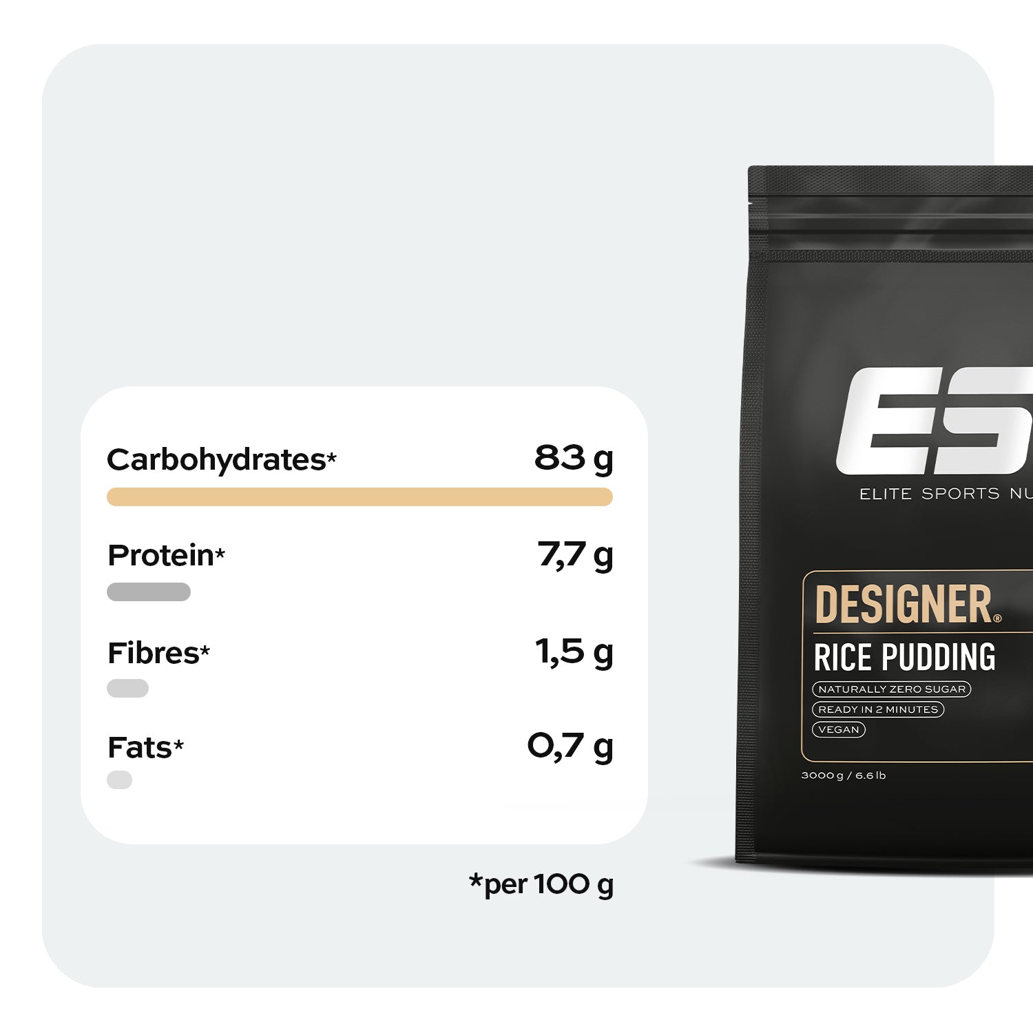 Are you looking for the perfect meal to provide yourself with an effective and easily digestible source of energy around your workout? Then you've just found it: With our Designer Rice Pudding, you can optimally supply your body with high-quality, complex carbohydrates from rice before training, without burdening it with difficult-to-digest food, or refuel after training and optimally fill your glycogen stores. And the best thing: the rice pudding has a low fat content and is sugar-free - which also makes it ideal as a snack for a low-calorie diet.