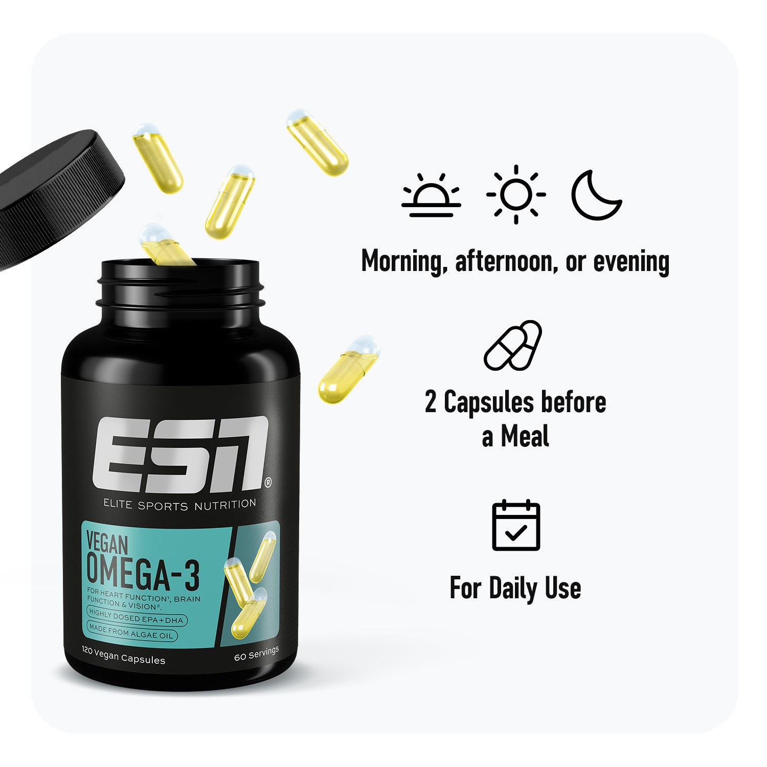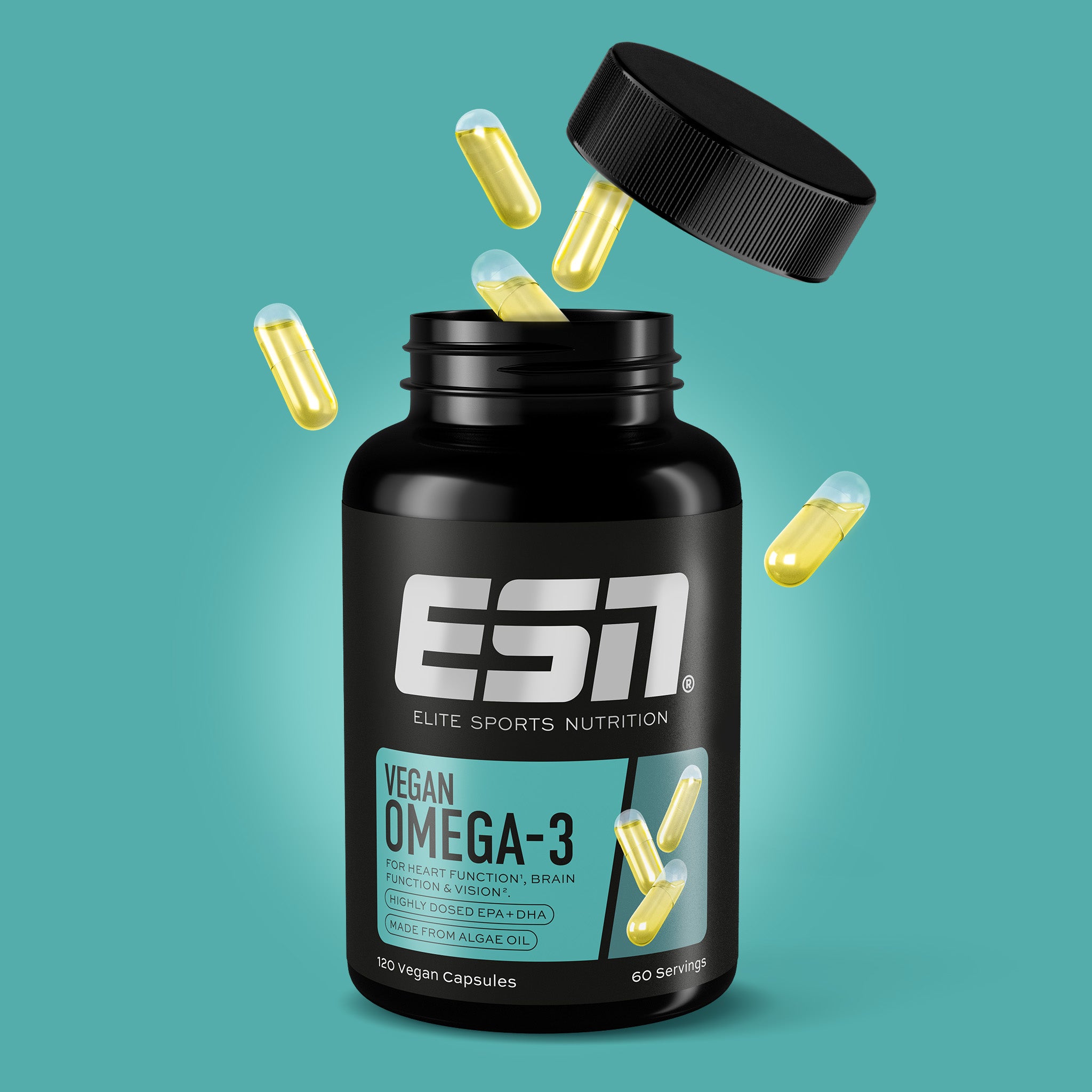 Omega-3 goes vegan! Our Vegan Omega-3 capsules provide you with EPA and DHA from sustainable sea algae. For optimal support of your heart, brain, and vision.1,2,3