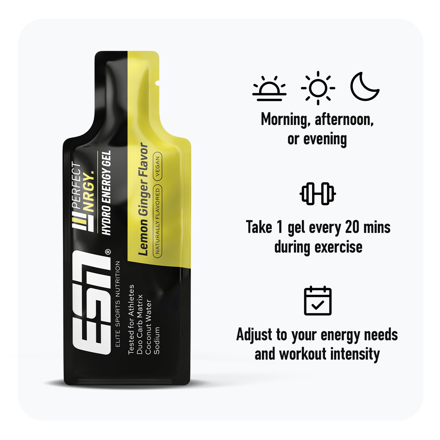 The solution? Perfect NRGY Energy Gel. Lightweight, easy to use, and made for performance. With a Dual Carb Matrix (dextrose + dextrin), coconut water powder, and 188 mg of sodium, it delivers instant and long-lasting energy — while supporting your hydration levels.1,2 Plus, it’s fructose-free for easier digestion — ideal during high-effort sessions.