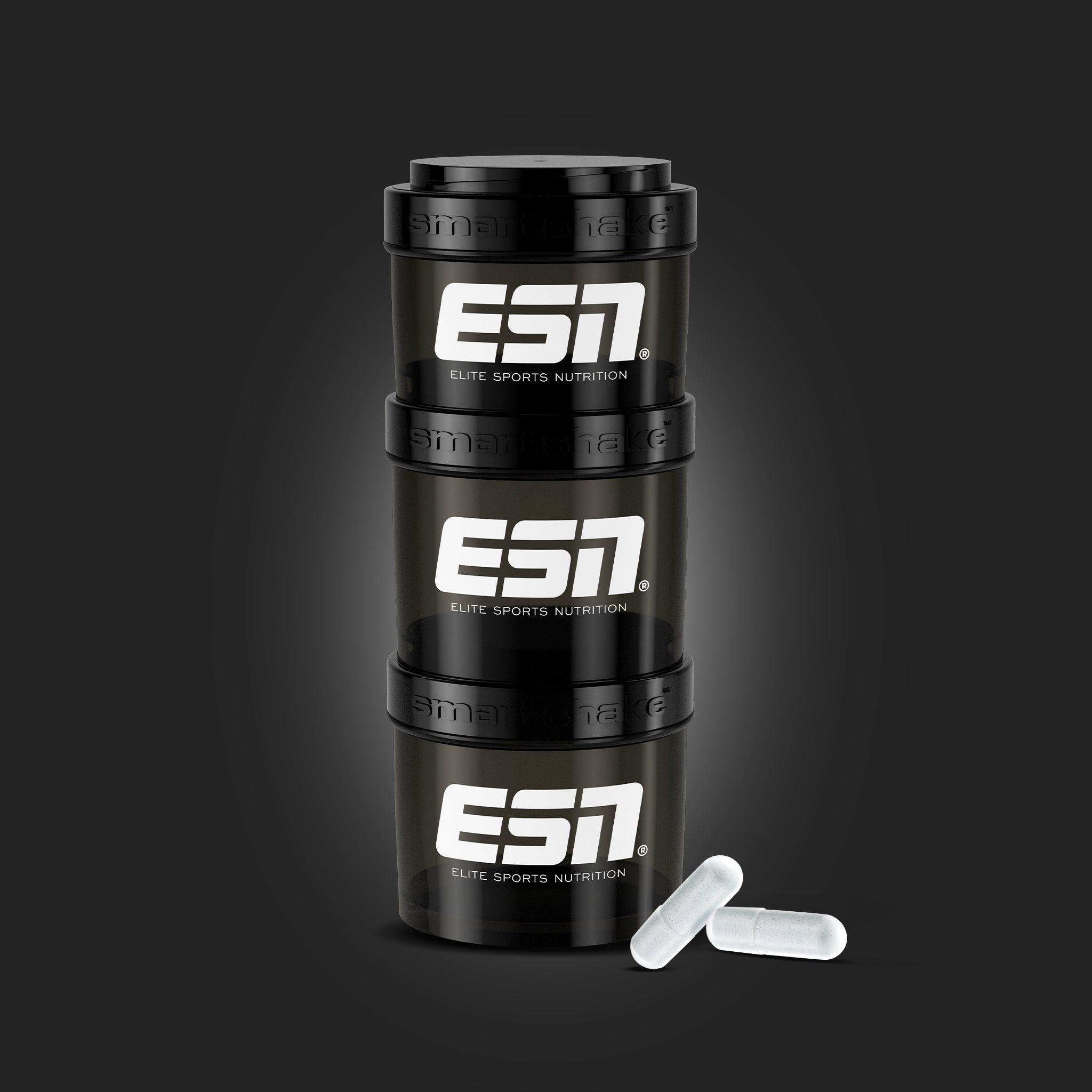 Three stackable containers for powders, capsules & snacks – perfectly organised on the go.