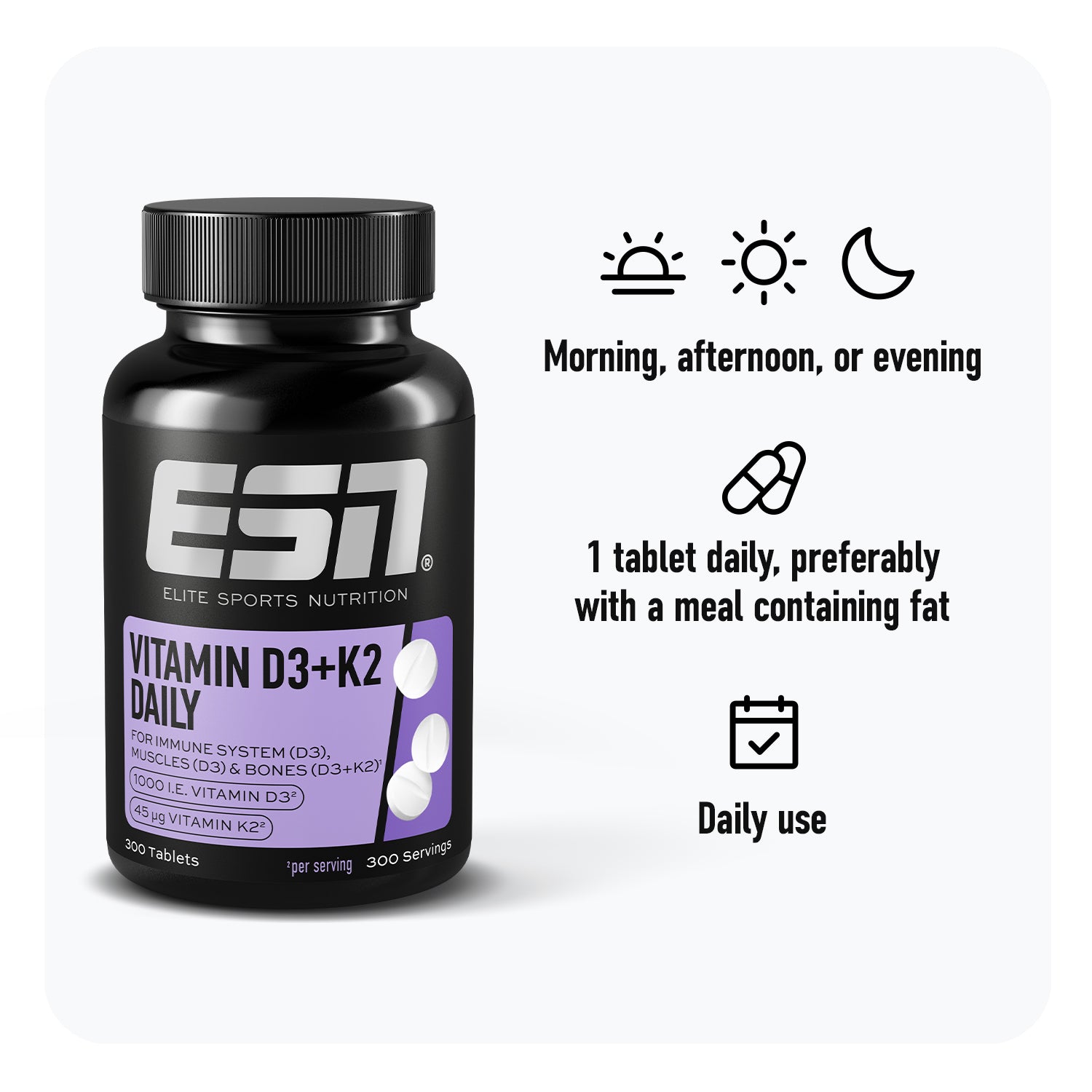 With 1000 IU of vitamin D3 & 45 μg of vitamin K2 per tablet – for immune system (D3), muscles (D3), and bones (D3 + K2)